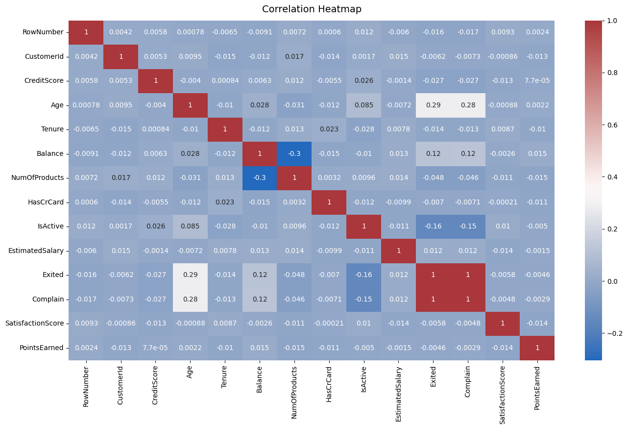 Correlation heatmap from the data analysis in Python that revealed the strong relationship between customers who complained and those who exited the bank (variables 'Exited' and 'Complain'):